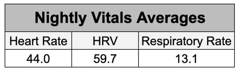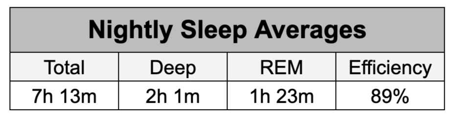 Oura records a lot of metrics (full list here), but the ones I track most closely are total sleep, deep sleep, REM sleep, sleep efficiency, bedtime, heart rate, heart variability, and respiratory rate (breaths per minute).
